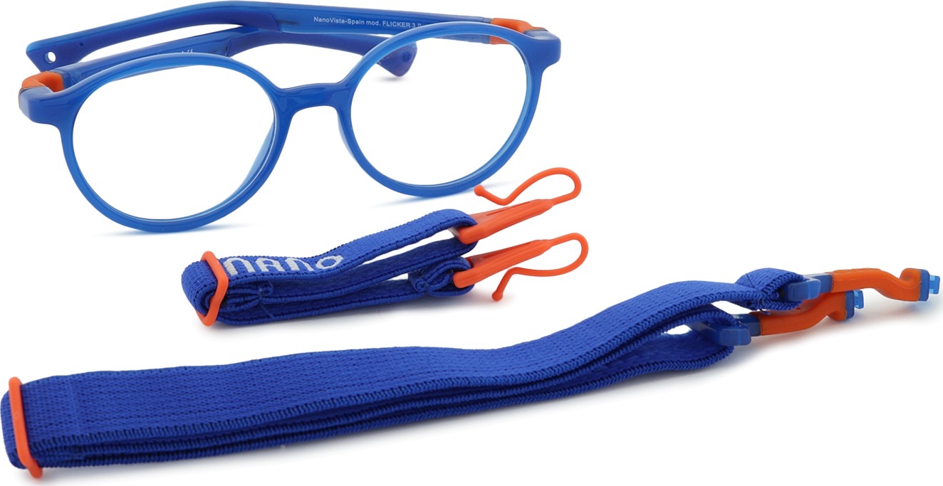 Flicker 3.0 -mallissa on kaksi säädettävää tekstiilihihnaa, jotka vähentävät silmälasien katoamisriskiä ja parantavat niiden kiinnitystä päähän erilaisten lasten aktiviteettien aikana.