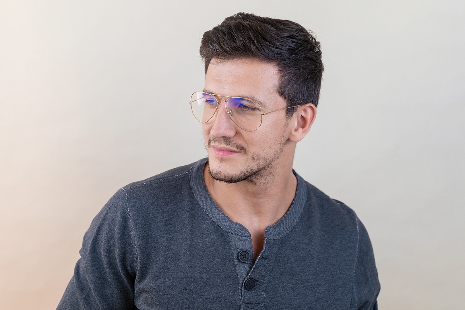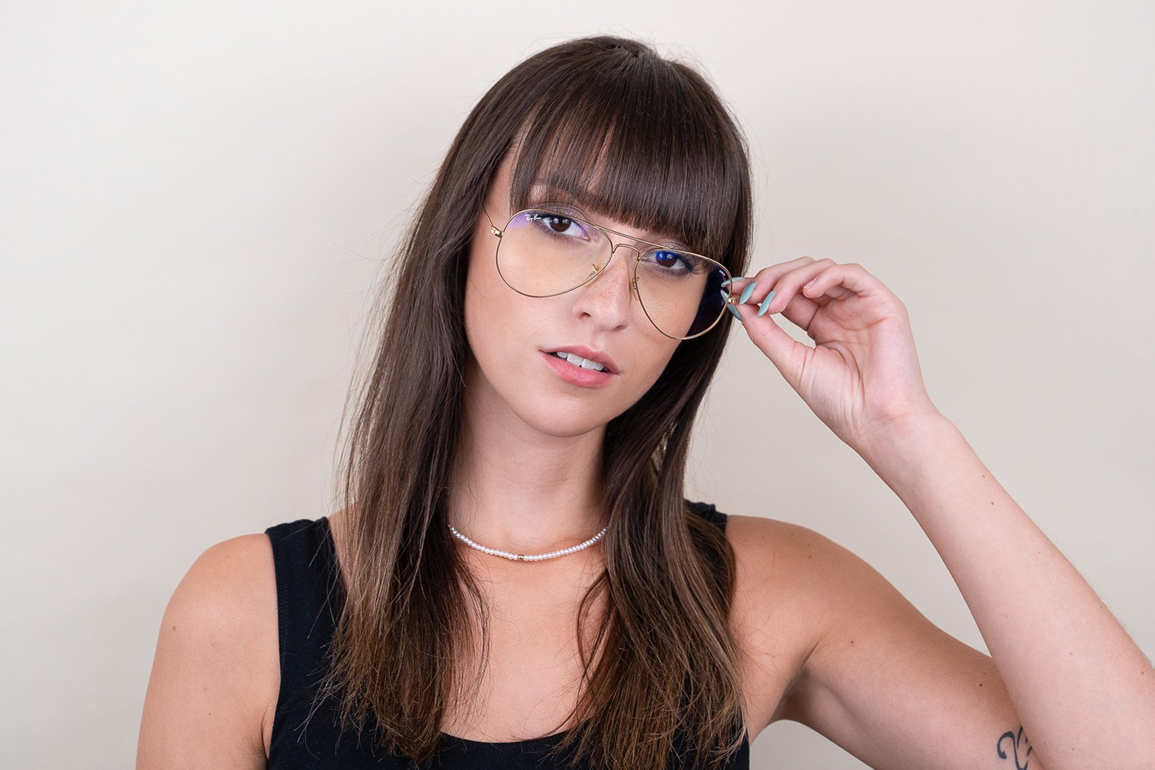 - Kehyksen kultainen väri sopii täydellisesti lämpimään ihonsävyyn ja tummanruskeisiin hiuksiin.