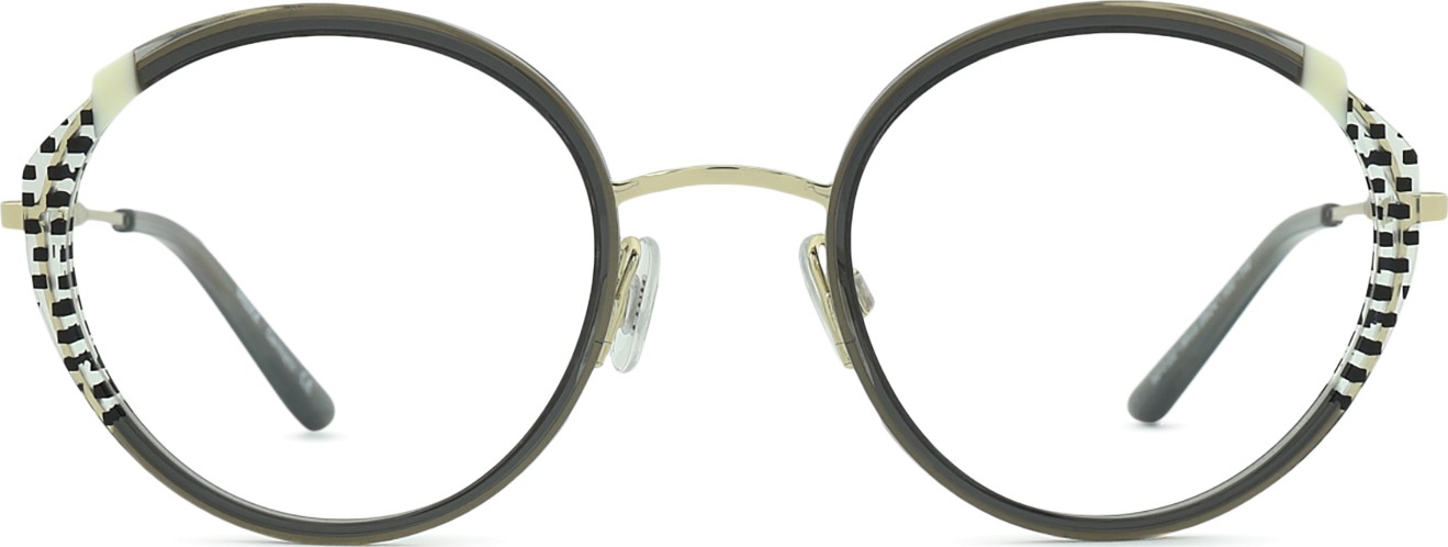 Glasögonens ram är tillverkad av en kombination av metall och plast. Det ger